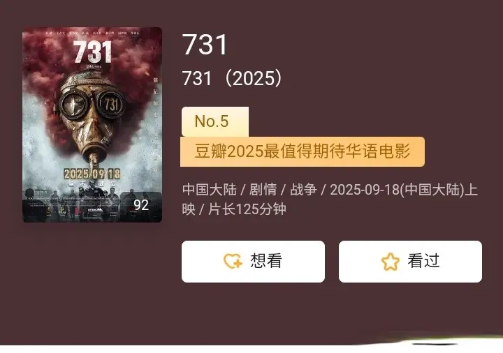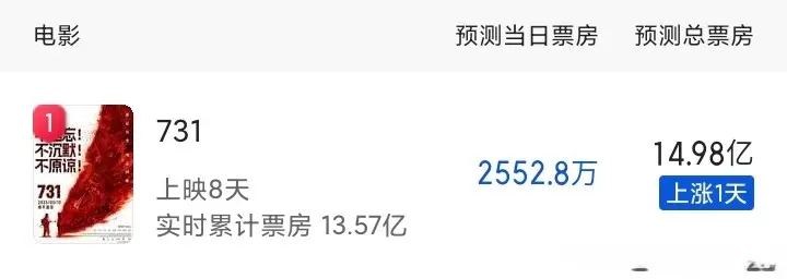 2025年9月18日,历史题材影片《731》登陆全国院线,首日票房报收3.45亿元,刷新今年国产片单日纪录。