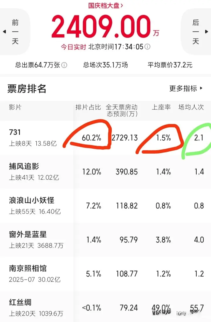 《731》上映8天上座率只剩1.5%,场均观看2人,这是妥妥的包场啊,