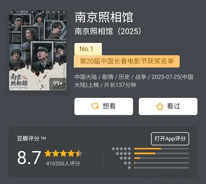 豆瓣、猫眼、淘票票至今未公布分数。业内人士分析,平台可能担心首轮评分过低进一步打击购票意愿,因此选择延迟开分;也有观众发现短评区负面内容显示异常,质疑“控评”。在海外IMDb平台,影片开分3.2,随后跌至2.5,与《南京照相馆》8.1分形成差距。